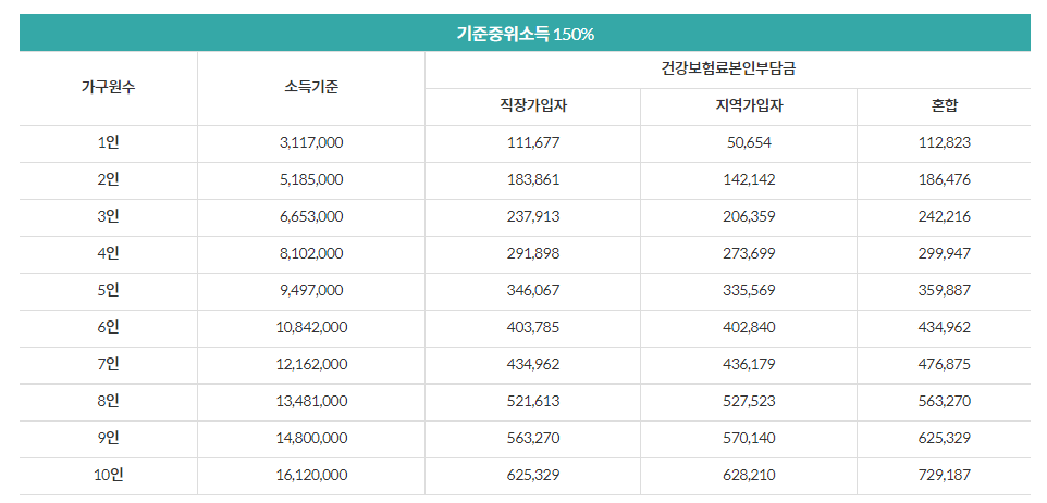 2023년도 1인 가구 기준중위소득 150% 이하 건강보험료 부과액은 직장가입자 111,677원, 지역가입자 50,654원이며, 2023년도 보건복지부 건강보험료 소득판정기준표를 참고하면 기준중위소득을 확인할 수 있습니다.